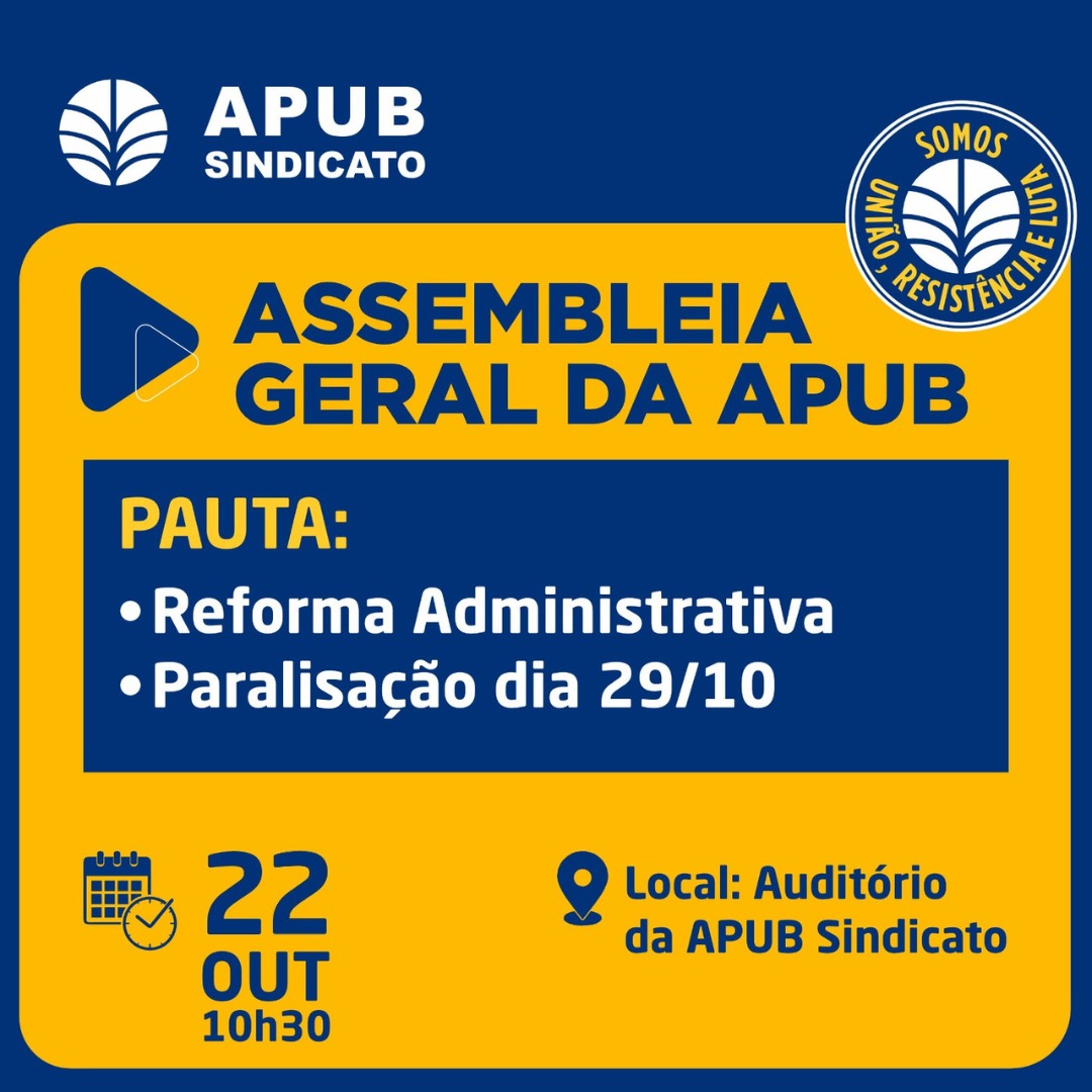 A APUB Sindicato convoca os/as docentes para uma assembleia geral, no próximo dia 22 de outubro, quarta-feira, às 10h30, que terá como pauta a Reforma