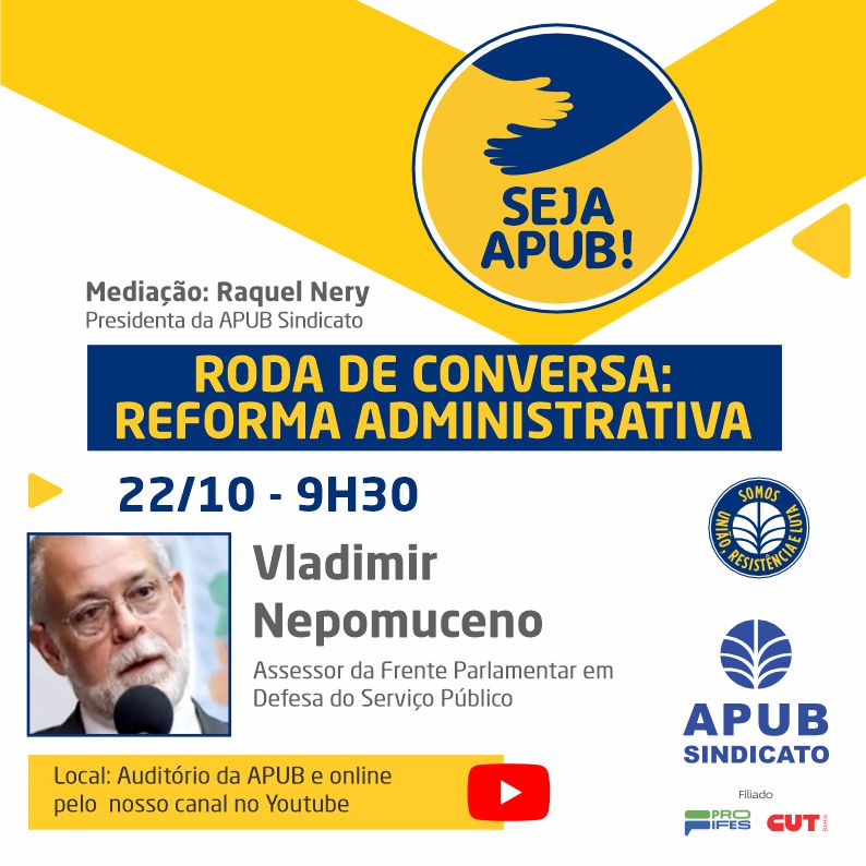 Amanhã (quarta-feira, 22 de outubro), às 9h30, a APUB Sindicato promove uma roda de conversa sobre a Reforma Administrativa, com
