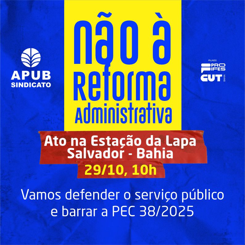 Esta quarta-feira (29/10) é dia de mobilização nacional contra a Reforma Administrativa! A APUB estará nas ruas, juntamente com a CUT e demais centrais sindicais, em ato unificado contra PEC 38/2025, conhecida como a nova proposta de Reforma Administrativa. Em Salvador o ato será na Estação da Lapa, a partir das 10h, e tem como objetivo alertar sobre os riscos da proposta para os serviços públicos e para os direitos da população.