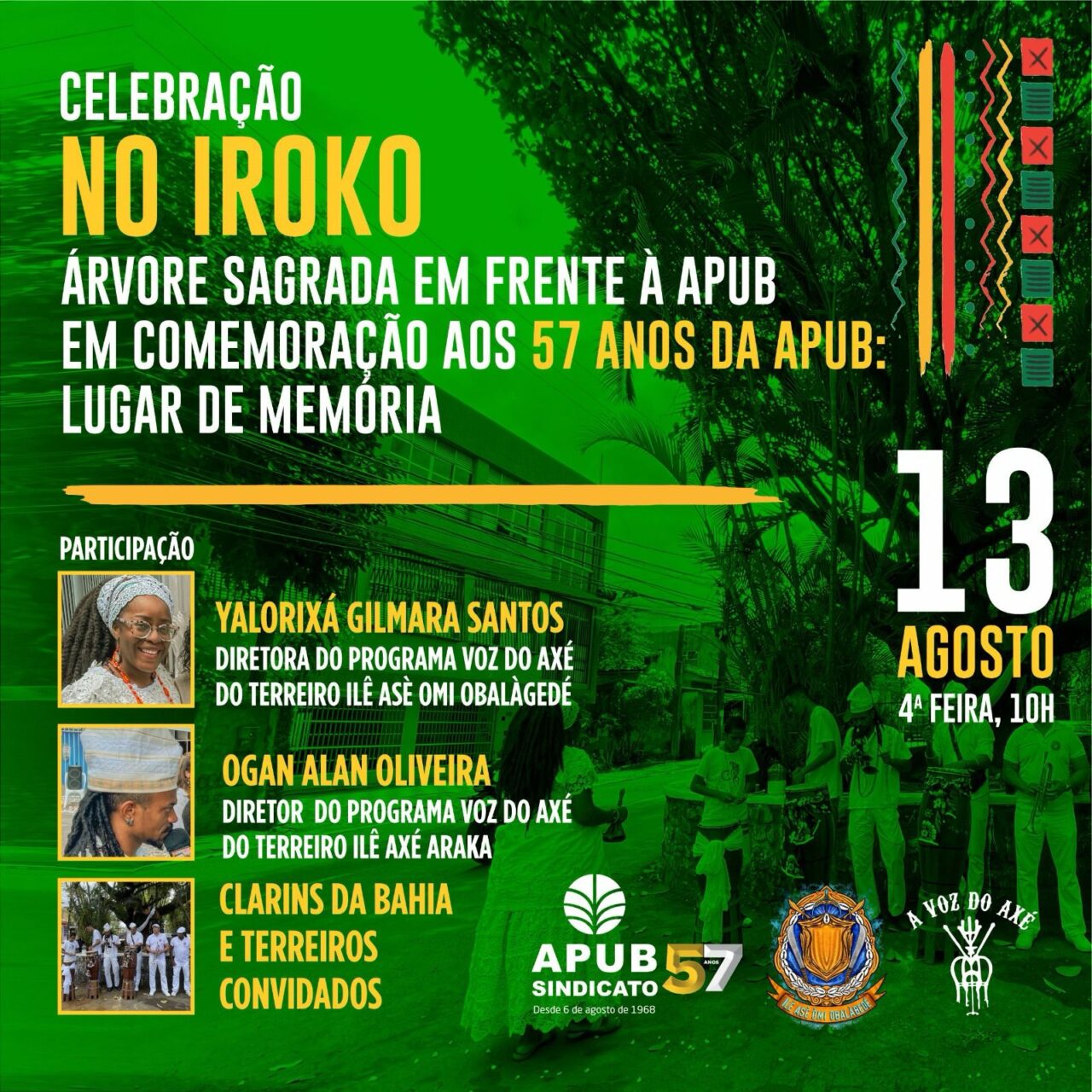 O Iroko – árvore sagrada para religiões de matriz africana, localizado ao lado da sede da APUB – volta a ser palco das comemorações pelo aniversário do Sindicato. Na próxima quarta (13), às 10h, a Ialorixá Gilmara Santos, o Ogan Alan Oliveira, o grupo Clarins da Bahia e representantes de terreiros convidados se unem a professoras e professores pela celebração dos 57 anos da APUB. Toda a comunidade está convidada para mais este encontro multicultural, de memória e resistência.