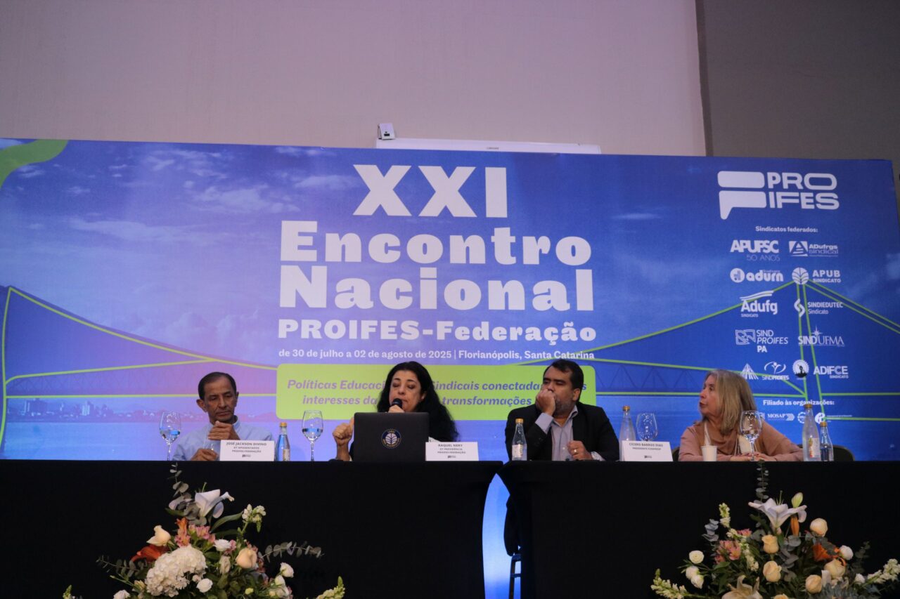 A diretora de seguridade social do PROIFES-Federação e presidenta da APUB Sindicato, Raquel Nery, conduziu a mesa do Eixo 4, “Aposentadoria e Previdência: os desafios da defesa dos direitos dos aposentados e um balanço da FUNPRESP”.  O debate aconteceu na tarde desta sexta (01) e contou com palestra de Cícero Rafael Dias, presidente da FUNPRESP.