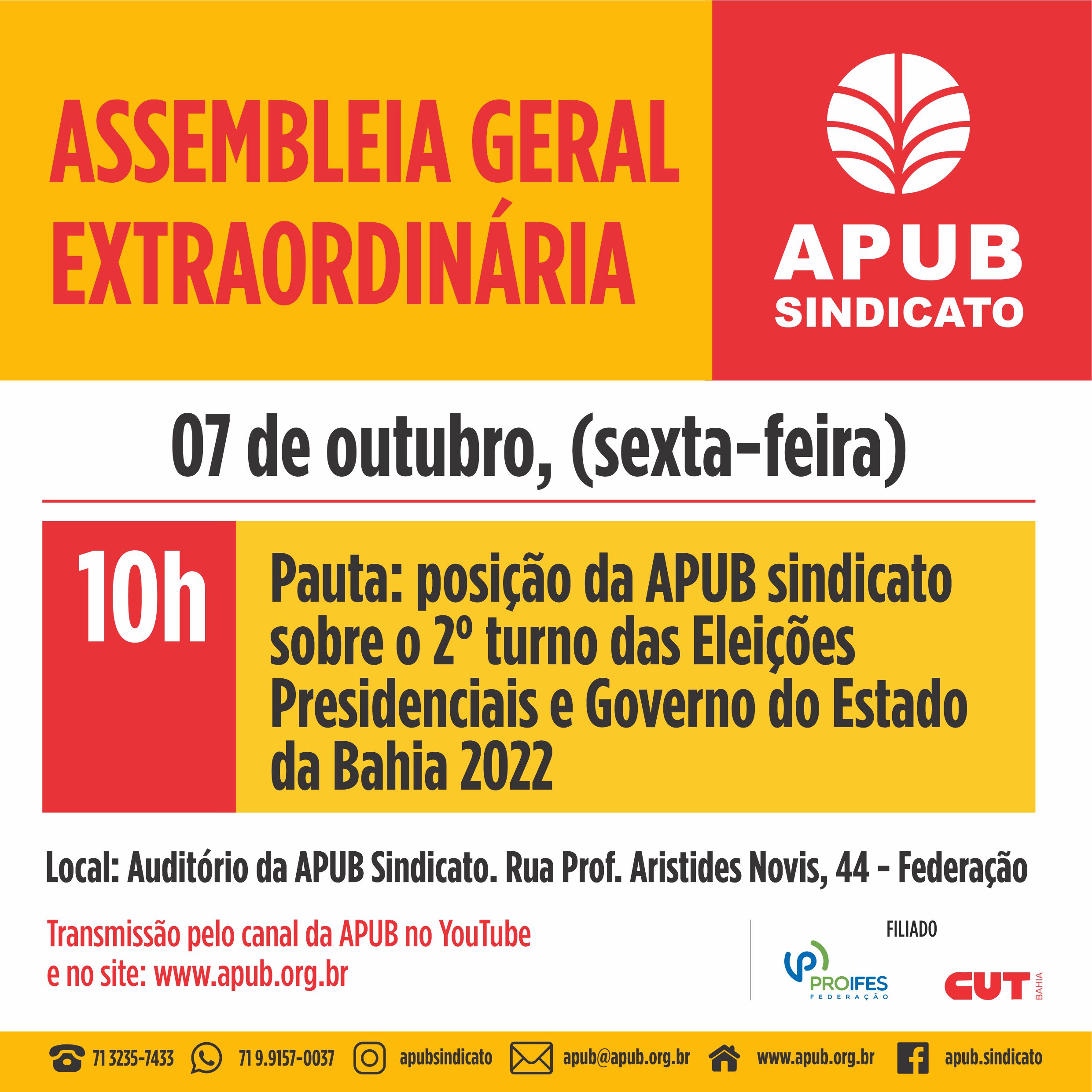 A APUB convoca as professoras e professores filiadas/os para uma Assembleia Geral Extraordinária no dia 07 de outubro, sexta-feira, às 10h, para discutir e deliberar