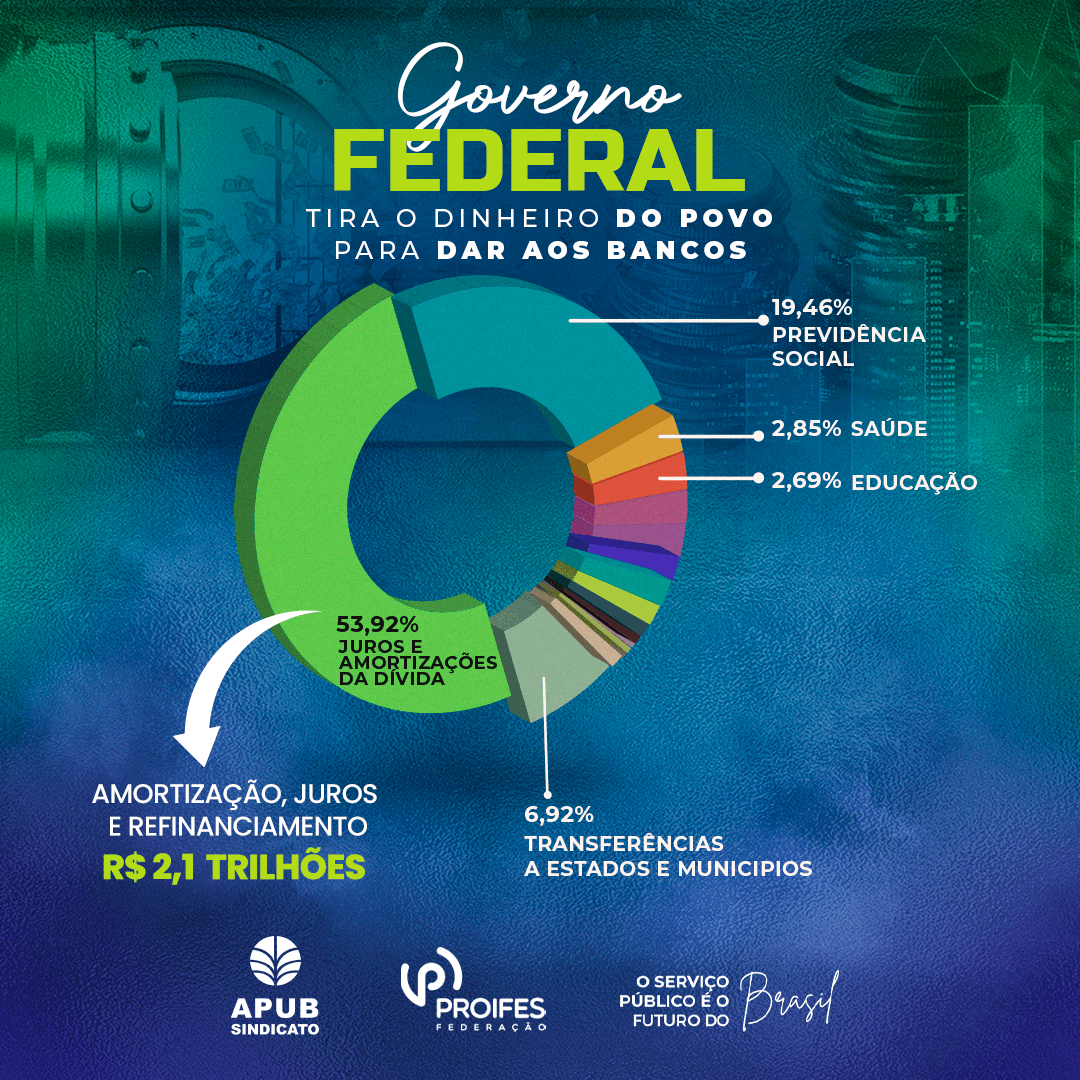 🔎 Em 2021, o Governo Federal destinará quase 54% para os bancos como pagamento da dívida pública (que nunca foi auditada, e ninguém sabe o quanto dela seria “real”). Serão mais de R$ 2,1 trilhões!