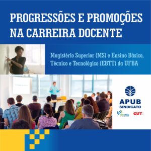 Confira a cartilha de progressões e promoções na carreira docente – Magistério Superior (MS) e Ensino Básico, Técnico e Tecnológico (EBTT) elaborada pela Apub. Na