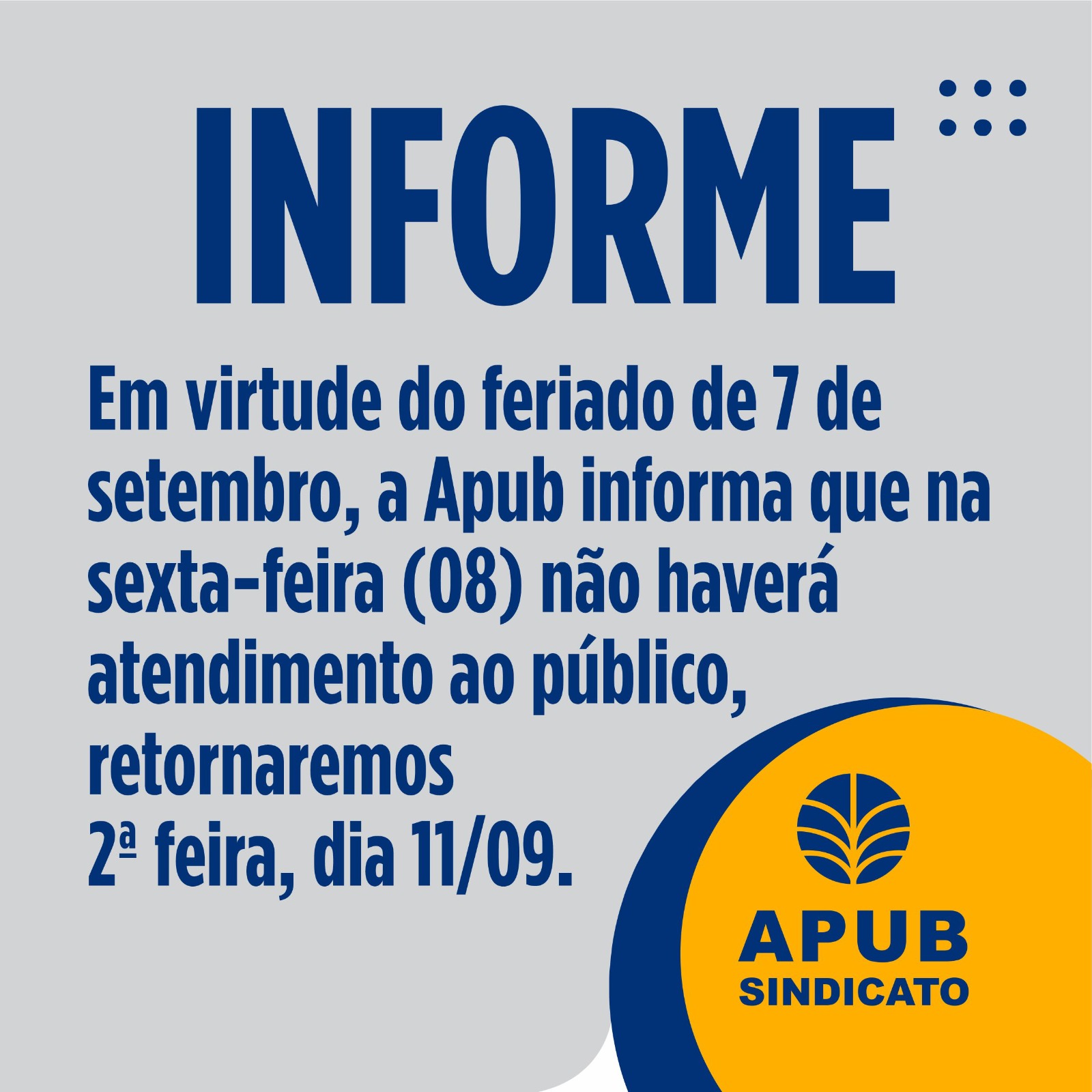 Em virtude do ponto facultativo decretado em todos os órgãos federais para o dia 8 de setembro, a Apub informa que não não haverá expediente
