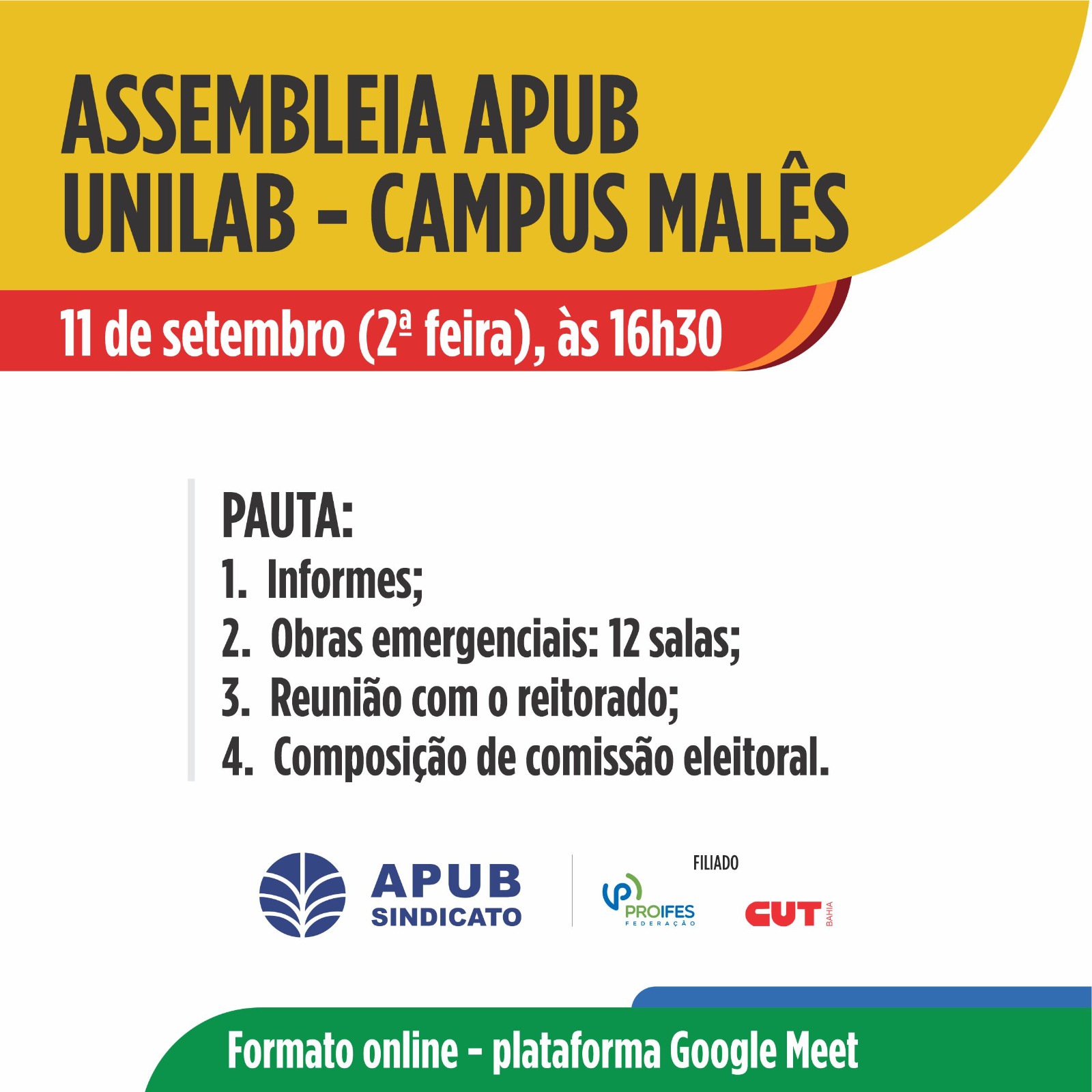 No dia 11 de setembro, a Apub fará Assembleia voltada para as/os docentes do campus dos Malês da UNILAB, às 16h30. Os pontos de pauta